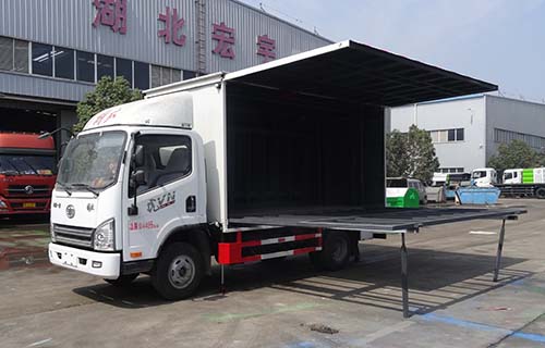 | 随底盘选装驾驶室,导流罩为选装件,选装后部门结构样式,选装裙边结构。车厢顶棚封闭,并采用衍架结构,可升降,车厢两侧板可展开,与顶棚形成整车舞台顶棚;活动舞台板可折叠于车厢内,通过展开装置展后与固定舞台台面形成整车舞台台面;底盘大梁部分设有支撑装置。ABS生产厂家/型号:上海万捷汽车控制系统有限公司/VIE ABS-II;侧防护采用冷弯型钢/Q235-A,焊接连接,后防护采用冷弯型钢/Q235-A,焊接连接,后防护截面高度尺寸120mm, 截面宽度尺寸50mm,下边缘离地高度350mm。该车作为流动演出的、可展开成为舞台。 |