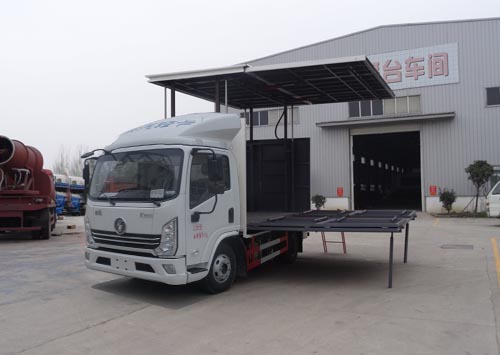 | 随底盘选装驾驶室,导流罩为选装件,选装后部门结构样式,选装厢体侧面开门样式。车厢顶棚封闭,并采用衍架结构,可升降,车厢两侧板可展开,与顶棚形成整车舞台顶棚;活动舞台板可折叠于车厢内,通过展开装置展后与固定舞台台面形成整车舞台台面;底盘大梁部分设有支撑装置。ABS系统生产厂家及型号为:广州瑞立科密汽车电子股份有限公司(型号:CM4XL-4S/4M)。侧防护采用冷弯型钢/Q235-B,焊接连接,后防护采用冷弯型钢/Q235-B,焊接连接,后防护截面高度尺寸100mm,截面宽度尺寸60mm,下边缘离地高度440mm。该车作为流动演出的、可展开成为舞台。 |