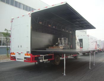 | 1.车厢舞台部分关闭时,顶部封闭;专用装置:折叠式平台,支腿,顶棚,侧厢;专用功能:作业时其侧板可展开或举升,中间侧板及内侧板向下展开平铺后,可形成用平台的地板.该车是进行舞台表演,展示的专用车辆;2.选装导流罩,选装裙边结构,选装厚顶驾驶室,选装侧窗和驾驶室前脸扰流板,驾驶室顶部装饰灯为选装件,选装侧工具箱, 选装后部单开门及安装位置,侧翼可选装单边开启,选装厢体侧图案;3.防护材质为Q235,形状为槽型,侧防护与车辆的连接方式为螺栓连接式,后防护与车辆的连接方式为焊接式,后防护的断面尺寸和离地高度分别为120mmX40mm和500mm;4.ABS型号生产厂:3631010-C2000,东科克诺尔商用车制动系统(十堰)有限公司;5.选装总长9990mm厢体舞台时,对应整备质量11795kg,后悬2960mm。随底盘选装前面板。 |