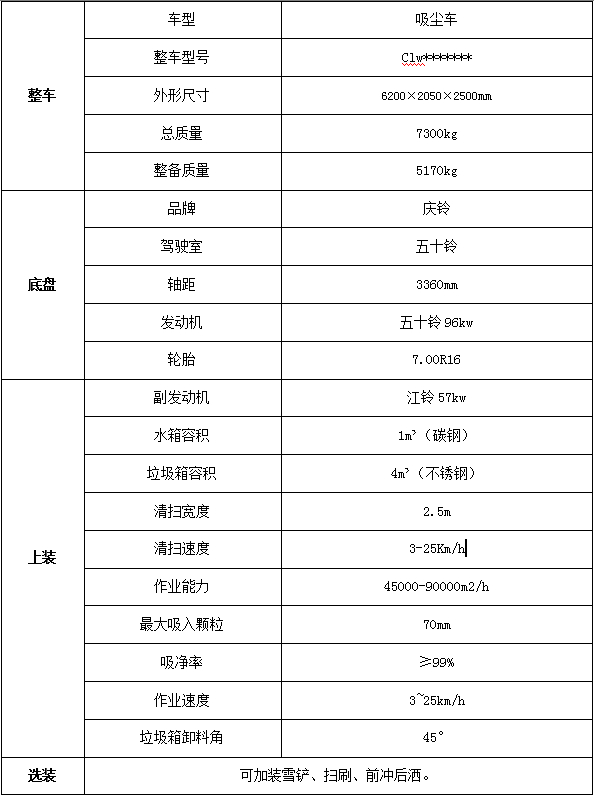 该吸尘车是采用型五十铃国五二类原厂汽车底盘改装,加装副发动机、风机、清水箱、垃圾箱、中置吸盘,工作视频探头,自动脉冲清理功能,液压系统、专用装置电控系统和副车架等改装而成(厂家电话:15391695203)。