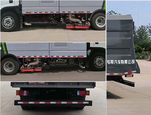 随底盘选装后视镜,轮眉,标牌。选装厢体样式。选装扫盘结构。选装制动系统,油制动对应ABS及其控制器型号为:APG3550500A,生产厂家为:浙江亚太机电股份有限公司,仅与4KH1CN6LB型发动机匹配;气制动对应ABS及其控制器型号为:CM4XL-4S/4M,生产厂家为:广州瑞立科密汽车电子股份有限公司。侧防护由多向工作吸盘代替;后防护采用冷弯型钢/Q235-B,螺栓连接。后防护截面高度尺寸180mm, 截面宽度尺寸50mm,下边缘离地高度400mm。该车主要用于城市道路清洁,主要专用装置为清水箱、垃圾箱、吸盘。 |