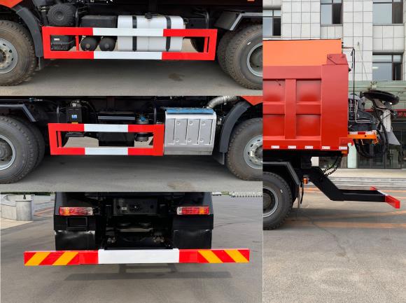 该车用于除雪,专用装置撒布机.选装滚刷,作业时安装滚刷,前伸1165mm,整车长11995mm;选装前平板支架时:前悬1780mm,整车长10220mm.侧后防护装置材质均为Q235,连接方式均为螺栓连接,后下部防护装置的断面尺寸为(mm):140?0,离地高度为460mm;ABS防抱死制动系统生产厂家:长春瑞立科密汽车电子有限公司,浙江万安科技股份有限公司,型号:CM4XL,VIE ABS-Ⅱ;仅选用轴距4300+1350(mm).安装具有卫星定位功能的行驶记录仪. |