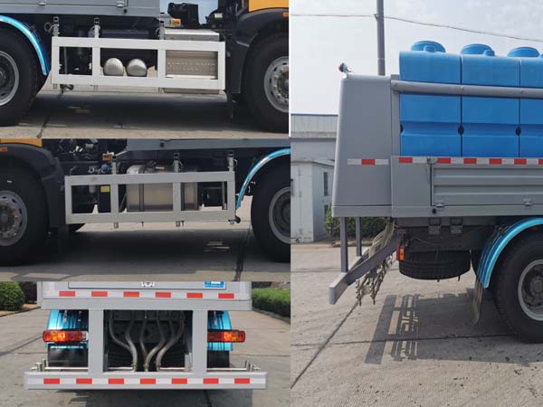 侧面防护装置材料为铝合金,后下部防护装置材料为Q345,与车辆的连接方式均为螺栓连接,后下部防护断面尺寸为160?0mm,最大离地高度495mm.ABS系统型号为4460046300,生产企业为威伯科(上海)管理有限公司。选装EBS,EBS系统型号为EBS3,生产企业为威伯科(上海)管理有限公司。轴距仅用3800+1350mm。随底盘可不选装遮阳罩,可不选装玻璃后风窗。该车用于道路除冰雪作业,安装有液体融雪剂撒布装置.驾驶室前端配专用挂架,用于安装除雪作业用雪铲和滚刷;仅在除雪作业时,前部连接支架选装除雪雪铲,前伸量1900mm,车长11130mm,整备质量变化小于3%。选装限速装置,最高车速(km/h)为80或89. |
