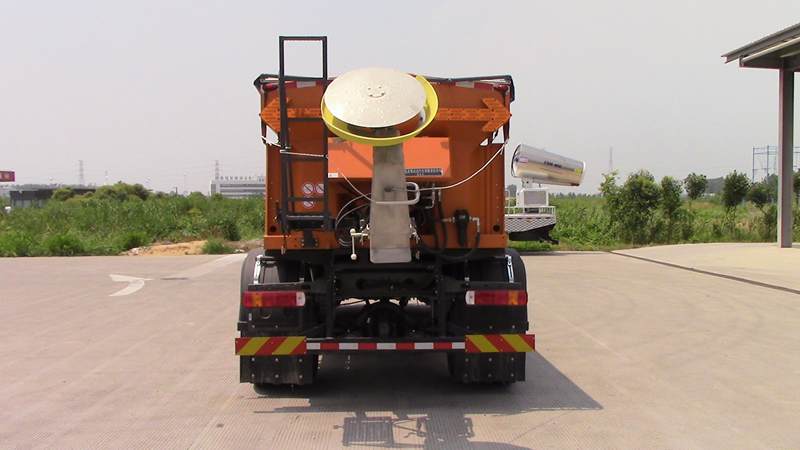 仅选用4500mm轴距;仅选用钢板弹簧悬架;后伸量为:1400mm;选装不带前支架及工作灯,车长8490mm,前后悬:1430/1160mm;选装一种撒布机外观;质量在误差以内忽略不计;侧防护材质为铝合金,连接方式:螺栓连接,后防护材质为Q235A,连接方式:螺栓连接,断面尺寸:60?20mm,离地高度485mm;ABS系统控制器生产企业/型号:威伯科(上海)管理有限公司/4460046300;安装带卫星定位功能的行驶记录仪;该车前部安装前安装架,仅用于该车除雪作业时安装除雪刷;仅在除雪作业时,前部安装除雪刷,前伸量2270mm;后部可通过撒布机甩盘进行撒布除雪作业; |
