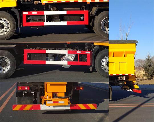 该车用于除雪,专用装置撒布机.选装滚刷,选装雪铲,作业时使用滚刷:前伸1340mm,整车长9955mm.作业时使用雪铲:前伸890mm,整车长9505mm.侧/后防护材料:Q235A,侧/后防护连接方式都为螺栓连接,后防护断面尺寸140?0(mm),离地高度为450mm.仅采用3800mm轴距.随底盘选装驾驶室.ABS型号/生产厂家:3631010-C2000/东科克诺尔商用车制动系统(十堰)有限公司,ABS 8/东科克诺尔商用车制动系统(十堰)有限公司,4460046450/威伯科汽车控制系统(中国)有限公司;安装具有卫星定位功能的行驶记录仪. |