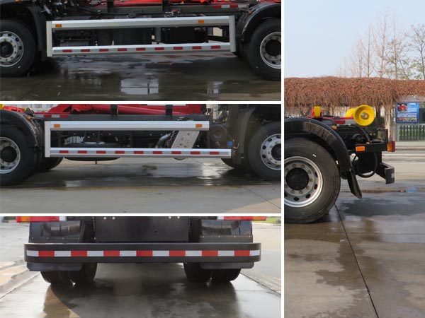 车辆主要用于城乡垃圾的收集、中转和运输,专用装置为装卸功能的拉臂钩.仅选用4500mm轴距.随底盘选装无车门裙板.选装不同结构的车门裙板.选装踏步结构.选装后部灯具.选装前雾灯.选装驾驶室卧铺侧窗装饰板.选装前下视镜.选装与车身颜色相同的前保险杠.驾驶室前脸扰流罩为选装件.选装驾驶室顶部装饰灯.选装后视镜.选装驾驶室前面罩.选装前保险杠及前部灯具.前悬(mm)/长度(mm)对应关系为:1400/7065,1430/7095.选装新式车辆外部标识牌.选装拉臂装置,对应整备质量7470kg,额定载质量10400kg(驾驶室准乘人数2人);10335kg(驾驶室准乘人数3人).选装ETC车载装置.选装D4.5NS6B190发动机时,油耗申报值为24.4L/100km;选装D6.7NS6B230发动机时,油耗申报值为23.7L/100km;选装DDi50E190-60发动机时,油耗申报值为23.9L/100km;选装B6.2NS6B210发动机时,油耗申报值为23.8L/100km;选装B6.2NS6B230发动机时,油耗申报值为23.8L/100km.安装具有卫星定位功能的行驶记录仪.ABS型号/生产厂家:3631010-C2000/东科克诺尔商用车制动系统(十堰)有限公司,ABS 8/东科克诺尔商用车制动系统(十堰)有限公司,4460046450/威伯科汽车控制系统(中国)有限公司.车辆侧面防护装置的材料材质为铝合金,后下部防护装置的材料材质为Q235钢,连接方式均为螺栓连接,后下部防护装置的断面尺寸(mm)为65?75,最大离地高度为455mm.