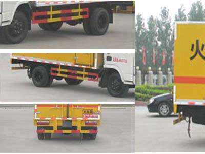随底盘选装前面罩以及前雾灯,选装右侧箱体不开门,厢体顶部封闭,不可开启:运输品名:黑火药,炸药,电引爆雷管,爆破炸药,烟花爆竹等,类项号:1.1B,1.1D,1.1G,1.2G,1.3G,1.4G 等; 防护材料:Q235A碳钢,连接方式:左右侧面及后下部防护均采用焊接连接,后部防护断面尺寸(mm):100?0,后部防护离地高度(mm):450,采用发动机型号CY4BK551,YC4FA115-50,D28D11-5DA,对应油耗值分别为12.4;12.6;12.6。该车安装带有卫星定位功能的行驶记录仪。仅采用前盘制动器和安装ABS以及前置消声器的底盘。采用子午线轮胎。安装限速装置,限速80km/h。ABS厂家及型号:襄阳东风隆诚机械有限责任公司/ABS/ASR-24V-4S/4M。 |