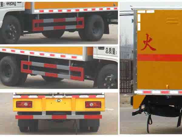 厢体顶部封闭,不可开启。随底盘选装驾驶室。 并选装侧开门。侧/后防护装置材料材质为Q235A碳钢,侧防护与副梁,后防护装置与车架均采用焊接连接,后防护断面尺寸(宽赘?50?00(mm),离地高度为440mm.运输品名:炸药,雷管,烟花爆竹等,类项号:1.1B,1.1D,1.1G,1.2G,1.3G,1.4G等;安装带卫星定位功能的行驶记录仪;配装限速装置,最高时速80km/h。仅采用有前盘制动器和安装ABS的底盘。仅采用子午线轮胎。仅采用排气管前置的底盘。该车装有ABS;ABS型号:355080020,生产厂家:浙江亚太机电股份有限公司。仅采用JX493ZLQ4发动机,油耗值为12.6。 |