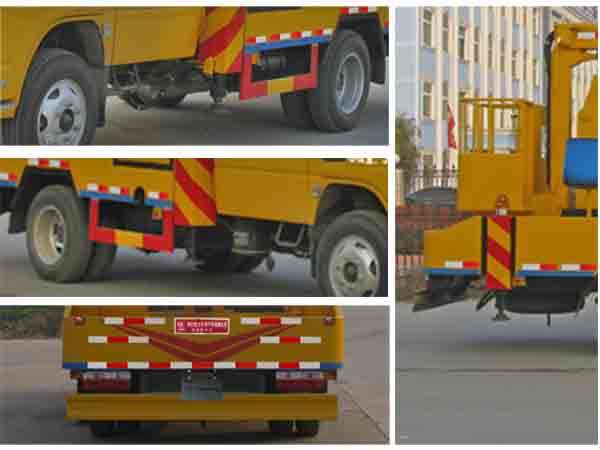 该车吊臂前伸为1100mm,作业高度为14米和16米。上装选装二节工作臂时,作业高度为12米。随底盘选装新造型的前围下面罩。驾驶室准乘人数(人): 2+3,3+3。防护材料:Q235A碳钢,连接方式:左右侧面及后下部防护均采用焊接连接,后下部防护断面尺寸(mm):180?0,后下部防护离地高度(mm):440,ABS厂家及型号:襄阳东风隆诚机械有限责任公司/ABS/ASR-24V-4S/4M。 |