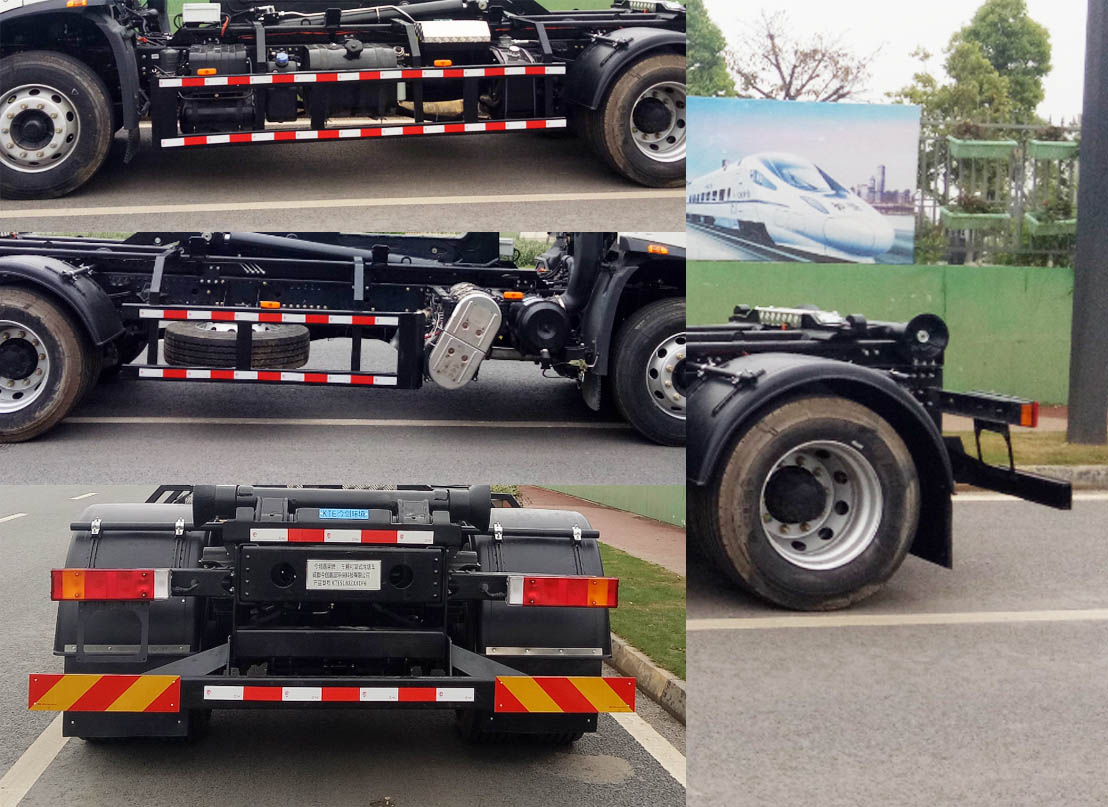 1.该车用于垃圾的收集清运,主要专用装置为勾臂;2.侧,后防护材料均采用Q235,连接方式为螺栓连接,后部防护断面尺寸(mm):125?0,离地高度460mm;3.该车选装D6.7NS6B230、D4.5NS6B190、DDi50E190-60、B6.2NS6B210、B6.2NS6B230型发动机,对应的油耗值分别(L/100km)为:23.7,24.4,23.9,23.8,23.8;4.ABS型号/生产厂家:3631010-C2000/东科克诺尔商用车制动系统(十堰)有限公司,ABS 8/东科克诺尔商用车制动系统(十堰)有限公司, 4460046450/威伯科汽车控制系统(中国)有限公司,安装带有卫星定位功能的行驶记录仪;6.随底盘选装高度不同的驾驶室;选装前雾灯;选装驾驶室顶部装饰灯;选装驾驶室前面罩;选装前保险杠及前部灯具,选装后视镜;选装后部灯具;驾驶室前脸扰流罩为选装件;驾驶室卧铺侧窗选装装饰板;选装踏步结构;选装后背式排气管,尿素罐位置. 7.仅选装4500mm和4700mm轴距.