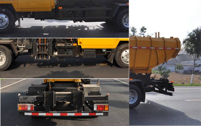 | 1.该车专用装置为:自装卸式垃圾清理装置;装备有污泥桶提升机构及后倾卸式车厢,将装有污泥的污泥桶悬挂在提升机构上,倾倒入车厢内,完成清理转运工作;2.防护材料为Q235钢材,采用螺栓与车辆连接,后下部防护尺寸(长卓碜高):1870?0?00mm,离地高度380mm;3.ABS及其控制器型号/生产企业对应关系为::APG3550500A/浙江亚太机电股份有限公司,CM4YL/广州瑞立科密汽车电子股份有限公司;4.该车仅选用发动机型号为4KH1CN6LB,对应油耗值为16.12L/100km,最大净功率为87kW,排量2999ml;5.该车后部选装箭头灯.6.车厢侧面选装水箱. |