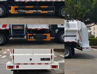 该车共2组配置:配置A(标准配置)、配置B(选装螺旋卸料装置),配置A:整备质量5750kg,额定载质量4605kg;配置B:整备质量6050kg,额定载质量4305kg。以上2种装置均可选装:1、称重系统,2、垃圾桶自动清洗消毒装置,3、后视影像,4、铝合金侧防护,以上4种选装配置引起的重量及整车尺寸变化可以忽略不计;侧防护及后防护材料材质:Q235B,侧防护连接方式:螺栓连接;后下部防护由箱体裙围代替,离地高度430mm;ABS型号/生产厂家:APG3550500H1/浙江亚太机电股份有限公司;该车主要通过液压控制系统实现车辆提桶专用机构的装卸作业,从而实现餐厨垃圾的收集和转运作业功能。 |