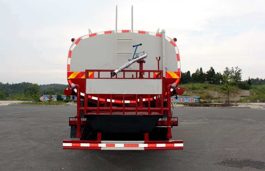 东风153后双桥18吨洒水车罐体采用机器压板一次性成型技术,采用先进旋边机,罐体包罐机工艺保证了罐体制作的精度和美观。全国独有烤漆工艺,防腐除锈,多层底漆、面漆喷涂。配备国内大功率洒水车专用水泵,可自吸自排,引水时间<15min,流量40m3/h,扬程35米。东风153后双桥洒水车其它专用部分标配为:前冲、后洒、侧喷、后工作平台、360度可调节绿化水炮,水泵垂直吸程≧7米,前冲洒水宽度≧14米,绿化水炮射程≧35米,自流阀、滤网、消防接口(可连接消防栓取水,可作应急消防用)。罐前量管(观察罐内水位)、罐后爬梯、罐上罐口带简易护栏、罐侧双炮筒、6米长4寸钢丝塑胶管两根,罐体表面双层油漆工艺,防锈、耐腐蚀,其余有厂家标配。可选择加装加装药盘、气动控制阀、喷药设备、罐内防腐等。