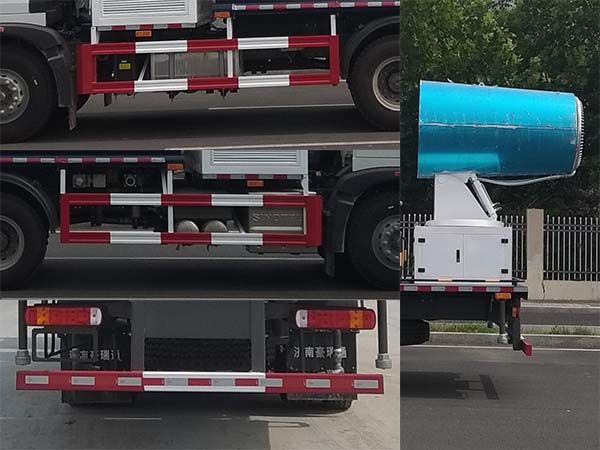该车主要专用装置为发电机组、风送式喷雾机和水箱,主要用于渣料场、储煤场、建筑及拆迁工地的降尘及除霾作业,仅选用轴距(mm)为4300+1350,4275+1400和钢板弹簧悬架的底盘。轴距(mm)为4300+1350对应后悬3250mm;轴距(mm)为4275+1400对应后悬3225mm。后伸660mm。前部发电机仓选装铝合金卷帘门,后部选装风送式喷雾机样式。选装限速装置,最高车速(km/h)为80或89。侧面及后下部防护装置的材质为Q235A,连接方式均为螺栓连接;后下部防护装置的截面尺寸为(宽赘?:60mm?20mm,离地高度为:490mm。ABS系统控制器生产企业/型号为威伯科(上海)管理有限公司/4460046300;选装EBS,EBS系统控制器生产企业/型号为威伯科(上海)管理有限公司/EBS3 |