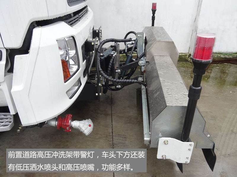 国五东风天锦路面高压清洗车罐体采用优质武钢碳钢板5mm厚,罐体容积8.5方,江铃副发动机;德国高压水泵(前置道路清洗支架/前冲/中置高压清洗枪)/后高低2套喷雾(21+16不锈钢喷嘴)20米冲洗水枪);威龙低压泵(前冲/后洒/绿化高炮);法国空间开关;尾部装LDE箭头灯。清洗宽度3.5米;清洗压力10MPa;高压冲洗高度大于等于21米。