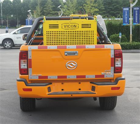 该车前部安装前安装架,该车安装动力设备时,整车长为5610mm,对应高度1960mm;该车选装两种撒布机样式,选装两种撒布机时,整车长都为6540mm,后伸都为930mm,对应高都为1840mm;该车作业时,安装雪铲+动力设备,整车长为6650mm,前伸1040mm,高1960mm;该车作业时,安装雪铲+撒布机,整车长为7580mm,前伸1040mm,后伸930mm,高1840mm;该车作业时,安装滚刷+动力设备,整车长为7250mm,前伸1640mm,高1960mm.该车随整车选装侧脚踏板,选装一种前部中网,选装一种轮辋;发动机最大净功率99kW.ABS系统控制器型号:APG3550500G,生产厂家:浙江亚太机电股份有限公司; |