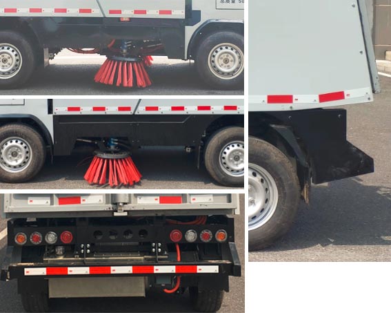 1.前扫刷可选装和非选装状态,选装前扫刷状态车长为5500mm、前伸量为800mm、接近角为10?未选装前扫刷状态车长为4700mm、接近角为15?2.本车随底盘可选装不同造型驾驶室,垃圾箱体可选装不同造型,前扫刷护板为选装,新造型整车长度5630mm,前悬1250mm,前伸715mm,后悬965mm,接近角13?离去角29?3.蓄电池种类/生产企业:磷酸铁锂蓄电池/宁德时代新能源科技股份有限公司;4.驱动电机生产企业/型号/类型/额定功率/峰值功率:上海盘毂动力科技股份有限公司/TZ260XS120/永磁同步电机/60kW/120kW;5.电机控制器生产企业: KTZ54X32S/上海盘毂动力科技股份有限公司;6.专用装置说明:车辆主要专用装置有扫路装置,对路面进行清扫作业;7.ABS型号/生产企业/控制方式:RL-3550/瑞立集团有限公司/4通道4轮独立控制,YF8/武汉元丰汽车电控系统有限公司/4通道4轮独立控制;8.车辆侧面防护装置为裙板结构,后下部防护装置的材料材质为Q235钢,与车架大梁螺栓连接,断面尺寸(mm)为50?00,最大离地高度为500mm.9.前部选装双刷,后部选装不同造型出风口,选装不同尾门轮廓,选装不同位置观察口小门及液位观察口 |
