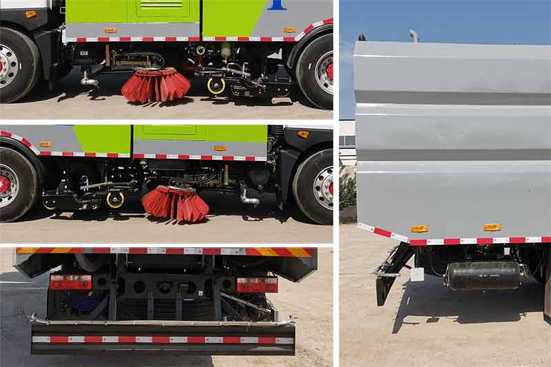 该车主要用于路面洗扫作业,主要专用装置为箱体和扫刷;整车长/轴距对应关系为(mm):7670/3950,8220/4500,8420/4700,8720/5000,9020/5300.左右侧面防护为扫刷,专用装置替代;后防护装置材料为Q235,连接方式为焊接连接;后部防护尺寸(宽赘?45?45(mm),后部防护离地高度(mm):400.随底盘选装驾驶室.ABS系统生产厂家,型号 :焦作博瑞克控制技术有限公司,J ABS.选装前后冲洗喷头样式,箱体外形样式. |