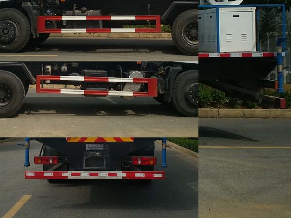 随底盘选装驾驶室.选装喷雾装置。仅采用4350+1350轴距底盘。侧防护采用Q235,螺栓连接。后防护采用Q235,焊接连接。后防护截面高度尺寸120mm,截面宽度尺寸50mm,下边缘离地高度500mm。ABS生产厂家;东科克诺尔商用车制动系统(十堰)有限公司,浙江万安科技股份有限公司,型号:3631010-C2000, VIE ABS-Ⅱ。该车用途为抑尘降霾,主要装置为水罐及喷雾装置.车辆长/轴距/前悬/后悬对应关系为:10650/4350+1350/1475/3475,10650/4350+1350/1515/3435,10450/4350+1350/1475/3275,10450/4350+1350/1515/3235. |