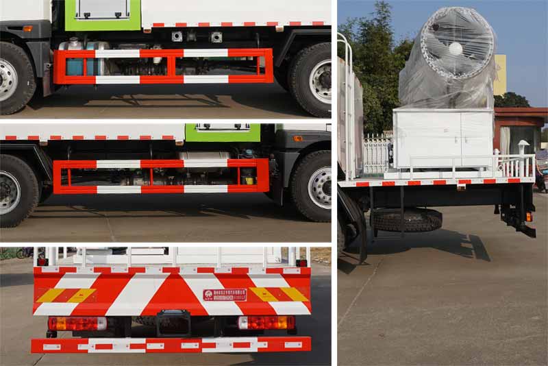 | 随底盘选装驾驶室.侧后防护采用Q235材质焊接连接,后部防护断面尺寸(mm):50?20,后部防护离地高度(mm):500.ABS生产厂家/型号:浙江万安科技股份有限公司/VIE ABS-II.该车用途为抑尘降霾,主要装置为抑尘罐,喷雾装置.选用4500mm轴距. |