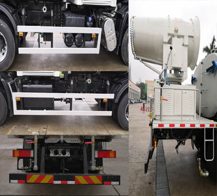 该车配有喷雾系统、储液箱、气控系统等装置,主要用于除霾降尘等作业。选装喷雾机组。随底盘选装驾驶室。选用4350+1350mm轴距。前悬为1480mm时,长度为10570mm、10810mm;前悬为1500mm时,长度为10590mm、10830mm。长度(mm)为10570、10590时,后伸630mm;长度(mm)为10810、10830时,后伸870mm。侧防护装置的材料为铝合金,采用螺栓连接;后防护装置的材料为Q345B,采用螺栓连接,截面尺寸为180?5mm,最大离地高度为425mm。安装具有卫星定位功能的行驶记录仪。随底盘安装的ABS型号/生产厂家:3631010-C2000/东科克诺尔商用车制动系统(十堰)有限公司,ABS 8/东科克诺尔商用车制动系统(十堰)有限公司,4460046450/威伯科汽车控制系统(中国)有限公司。 |