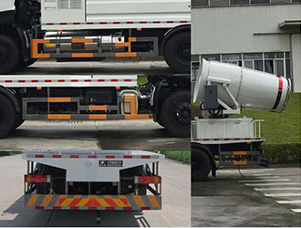 该车仅选用4350+1350mm轴距;该车型有两种配置:配置A(选装A型雾炮)、配置B(选装B型雾炮)、配置C(选装C型雾炮).各配置整备质量(kg)/载质量(kg)/长度(mm)/高度(mm)/后悬/后伸(mm)对应关系如下:配置A:15970/8900/10420/3980/2250/990;配置B:15450/9420/9890/3980/2250/460;配置C:13300/11570/9030/3530/1850/0;上述三种配置均可选装开花式高压喷枪和后花洒:侧防护及后部防护装置的材料材质:Q235A;连接方式为螺栓连接;后部防护装置的断面尺寸(宽赘?mm:60?30;后部防护装置的离地高度430mm;ABS型号为3631010-C2000,生产厂家为东科克诺尔商用车制动系统(十堰)有限公司;ABS厂家及型号还可为:威伯科汽车控制系统(中国)有限公司,ABS-E 4S/4M.该车配置有喷雾系统等专用装置,主要用于改善空气质量,降低空气中的灰尘,雾霾等现象. |