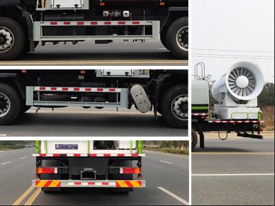 专用装置为抑尘雾炮,用于城市抑尘.防护材料:Q235A碳钢,连接方式:左右侧面及后部防护均采用焊接连接,后部防护断面尺寸(mm):150?0,后部防护离地高度(mm):500.ABS型号/生产厂家:3631010-C2000/东科克诺尔商用车制动系统(十堰)有限公司,ABS 8/东科克诺尔商用车制动系统(十堰)有限公司,4460046450/威伯科汽车控制系统(中国)有限公司.随底盘选装驾驶室. |
