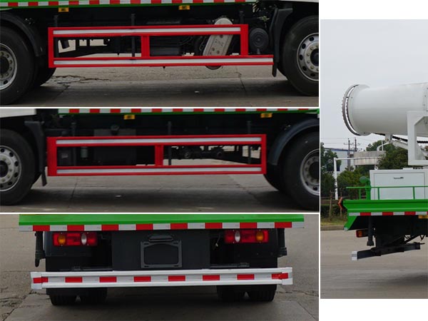 该车主要用途为抑尘、降霾、除尘,专用装置为储液罐,喷雾装置.整车长(mm)/前悬(mm)/后悬(mm)/轴距(mm)/后伸(mm)对应关系为:7800/1400/2450(1430/2420)/3950/无后伸,8700(8300)/1400/2400(1430/2370)/4500/400(无后伸),8900(8500)/1400/2400(1430/2370)/4700/400(无后伸),9200(8800)/1400/2400(1430/2370)/5000/400(无后伸).防护材料:Q235碳钢,连接方式:左右侧面及后下部防护均采用焊接连接,后部防护装置断面尺寸(宽赘?50?20(mm),后部防护离地高度(mm):450(mm).选装喷雾装置及摆放样式.随底盘选装高度不同的驾驶室;选装前雾灯;选装驾驶室顶部装饰灯;选装驾驶室前面罩;选装前保险杠及前部灯具,选装后视镜;选装驾驶室轮罩;驾驶室前脸扰流罩为选装件,选装侧部厢体结构及正后结构;装有具有卫星定位的行车记录仪.ABS型号:3631010-C2000,4460046450;生产厂家:东科克诺尔商用车制动系统(十堰)有限公司,威伯科汽车控制系统(中国)有限公司.仅采用3950(mm),4500(mm),4700(mm),5000(mm)轴距底盘. |