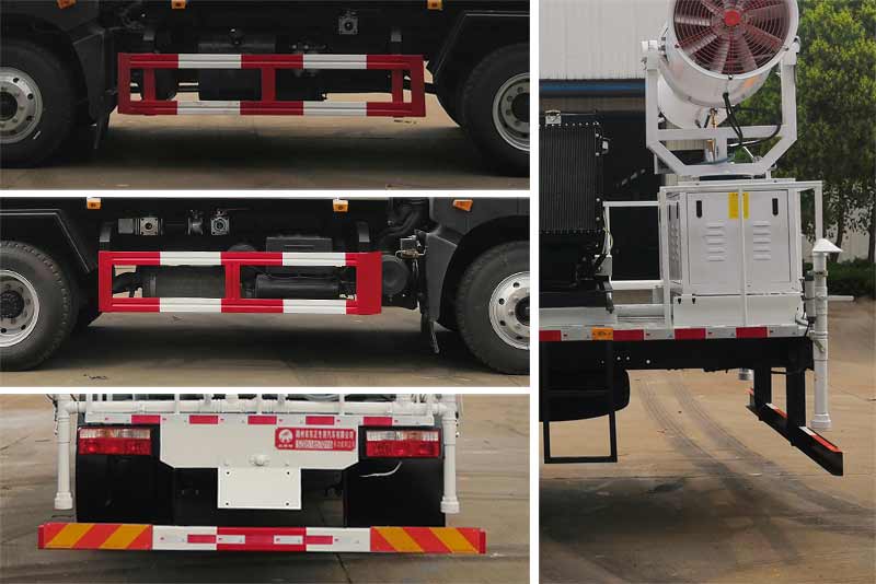 随底盘选装底盘附件安装位置.选装方圆管道箱,选装后雾炮装置,选装后喷雾,选装后高位花洒,选装LED箭头指示灯,选装后平台式样,选装后喷枪安装位置.侧后防护采用Q235材质焊接连接,后部防护断面尺寸(mm):50?20,后部防护离地高度(mm):480.ABS系统生产厂家,型号 :焦作博瑞克控制技术有限公司,J ABS.该车用途为抑尘降霾,主要装置为罐体及喷雾装置.选用3950mm轴距. |