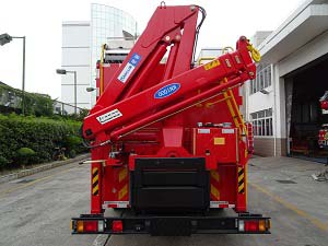 整体式侧防护结构,后防护装置材料:Q235A,截面尺寸:80?90mm,与车辆连接方式:螺栓连接,后防护离地高度:465mm,ABS生产企业为浙江亚太机电股份有限公司,型号为APG3550500H1。主要专用装置有随车吊,绞盘,照明系统。 |