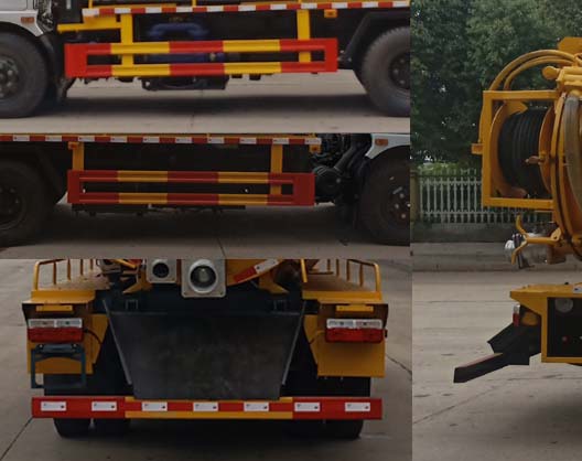 随底盘选装驾驶室;仅采用3800mm轴距;该车专用装置为清水罐和吸污罐,主要用于城市管网的清洗和疏通;清水罐和吸污罐为两个独立罐体,清洗功能时用水罐,吸污功能时用吸污罐,清洗吸污两种功能不能同时使用,两种罐体不能同时满载;罐体尺寸为(直段长字本?(mm):4000?400,其中罐体前段为清水罐(直段长字本?mm):2200?400);后段为污水罐(直段长字本?mm):1800?400),污水罐有效容积3立方米,清水罐有效容积2.5立方米;侧防护材料Q235,螺栓连接;后防护材料Q235,焊接连接,后防护截面高度尺寸120mm,截面宽度尺寸50mm,下边缘离地高度380mm;ABS系统生产厂家/型号:襄阳东风隆诚机械有限责任公司/ABS/ASR-24V-4S/4M;罐体带有举升功能;该车专用装置主要由罐体和泵组成,用于下水道排污及疏通. |
