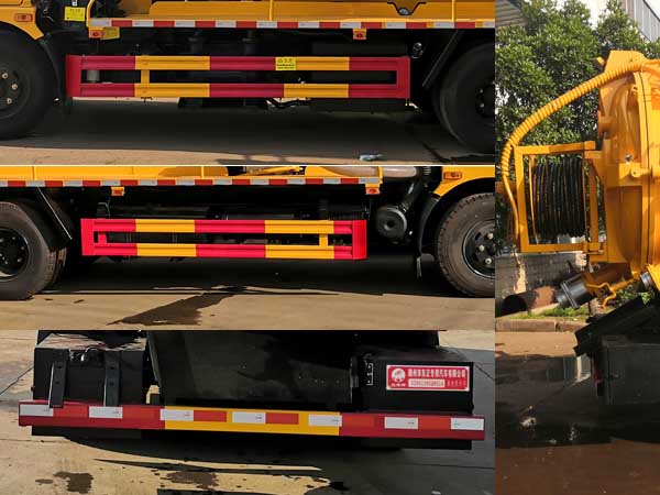 随底盘选装同系列驾驶室及导流罩.选用3800mm轴距.选装罐顶部平台.罐体外形尺寸(直段长字本?(mm):4200?600(其中罐体前部1580mm为清水罐),污水罐罐体有效容积5.25立方米,介质:液态污物;清水罐罐体有效容积3.15立方米,介质:水.清洗和吸污功能不同时使用,两罐不能同时满载.侧后防护采用Q235材质焊接连接,后部防护断面尺寸(mm):50?20,后部防护离地高度(mm):450.ABS型号及生产厂家为:3631010-C2000/东科克诺尔商用车制动系统(十堰)有限公司,J ABS/焦作博瑞克控制技术有限公司.专用装置为罐体,吸污泵等,用于吸除污浊物和清洗作业. |