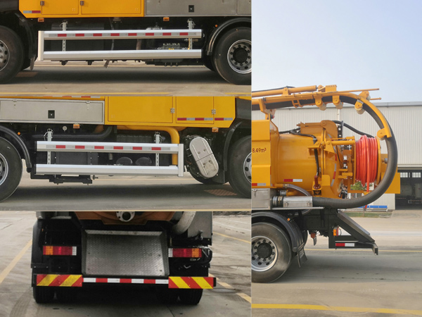 吸污罐罐体外形尺寸(直径壮?:1512mm?952mm;吸污罐有效容积为8.49立方米,介质为液态污物,密度:900千克/立方米。清水罐截面为多边形组成,截面积为0.678立方米,长度为3300mm,清水罐的有效容积为4.47立方米,介质为水,密度是1000千克/立方米。清水罐和吸污罐不能同时满载。当驾驶室准乘人数为2人时,额定载质量为7350千克。侧防护材料材质为铝合金,侧防护与副车架螺栓连接;后防护材料材质为Q235A,后防护与大梁螺栓连接,后防护断面尺寸为120mm?0mm,离地高度为425mm。仅采用底盘轴距为4350mm+1350mm。装备ABS,ABS型号/生产厂家:3631010-C2000/东科克诺尔商用车制动系统(十堰)有限公司,ABS还可为ABS 8/东科克诺尔商用车制动系统(十堰)有限公司或4460046450/威伯科汽车控制系统(中国)有限公司。随底盘选装驾驶室、后部组合灯具。该车主要专用装置罐体、高压水泵、吸污泵、管道系统等,用于下水管道的冲洗疏通及管道内污水的收集。 |