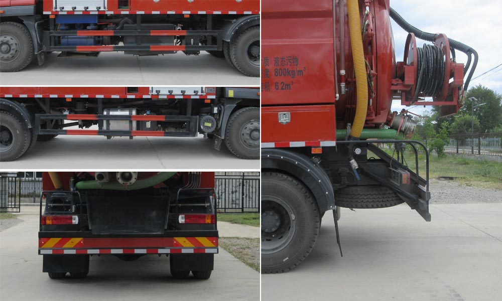 | 随底盘选装驾驶室前格栅及logo;随底盘安装具有卫星定位功能的行驶记录仪;样车后伸615mm;罐体尺寸为直线段长字本?mm):3850?620,其中罐体前端为清水罐(外形尺寸长450mm,效容积1立方米,介质:水);后端为污水罐(外形尺寸长3400mm,有效容积6.2立方米,介质:液态污物,密度:800千克/立方米);侧防护材料为Q235-A,连接方式:焊接;后防护材料为Q235-A,连接方式:焊接,截面尺寸为(宽赘?(mm):90?00,离地高度为:450mm;ABS型号为CM4XL-4S/4M,生产厂家为广州瑞立科密汽车电子股份有限公司;发动机WP4.6NQ220E61最大净功率为158kW;专用装置作业功能:清洗功能时用罐体前部清水罐,吸污功能时用罐体后部污水罐,安装真空泵、高压水泵及管路,实现下水管道的冲洗疏通及管道内污水的收集与运输. |