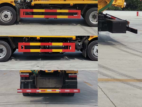 随底盘选装前面罩,前保险杠,前组合灯具,前雾灯。罐体外形尺寸(直段长字本?(mm):4000?600(前部1000mm为清水罐,后部3000mm为污水罐)。污水罐载质量为4900kg,有效容积:5.7立方米;清水罐载质量为2500kg,有效容积:2.5立方米.清水罐和吸污罐为独立罐体,清洗功能时用水罐,吸污功能时用吸污罐, 污水罐和清水罐不可同时满载。侧防护采用冷弯型钢/Q235,螺栓连接。后防护采用冷弯型钢/Q235,焊接连接。后防护截面高度尺寸100mm,截面宽度尺寸50mm,下边缘离地高度430mm。采用3800轴距底盘.ABS型号/厂家:ABS型号:ABS/ASR-24V-4S/4M,厂家:襄阳东风隆诚机械有限责任公司。专用装置为罐体,高压泵等,主要用于清洗吸污。随底盘选装驾驶室。 |