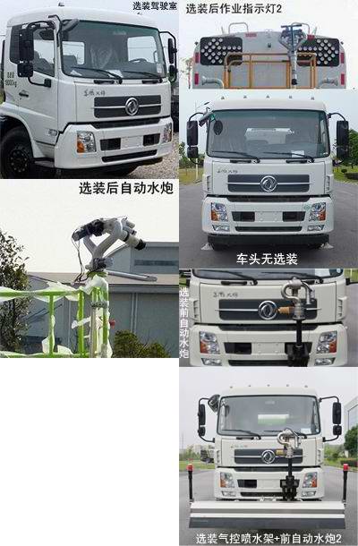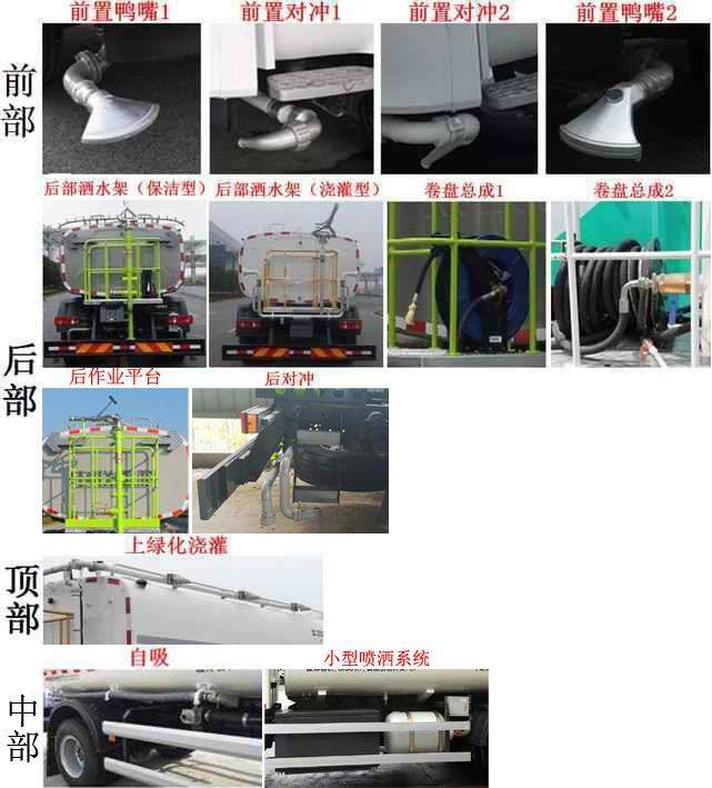 该车配有水罐,水路和控制系统等,用于清洗作业,该车选用底盘5000mm轴距,选装喷水架、前喷水架+前自动水炮时,前伸为870mm,整车长为9105mm,接近角10?选装前自动水炮时,前伸为750mm,整车长为8985mm,接近角10?选装车头无选装装置时,前伸为0mm,整车长为8235mm,接近角16?罐体有效容积8.35立方米,罐体外形尺寸(长轴锥讨嶙长度)(mm):2230?280?780,侧面防护装置的材料为铝合金,连接方式为螺栓连接;后部防护装置的材料为Q345A,连接方式为螺栓连接,断面尺寸为240?5毫米,离地高度为430毫米.该车可配置装车头无选装装置,后自动水炮,鸭嘴,前后对冲,后部保洁型,后部浇灌型,卷盘,后作业平台,后作业指示灯,上绿化浇灌,自吸,小型喷洒系统,该系列选装对于整车尺寸,重量变化可忽略不计;随底盘选装驾驶室外观;该车技术阶段为 |