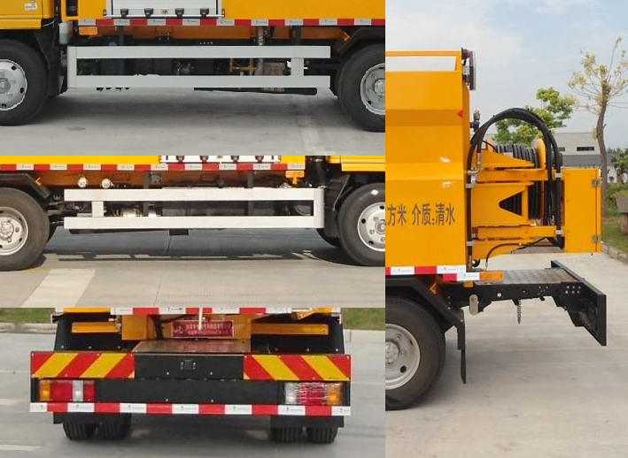 罐体有效容积3.26立方米,罐体外形尺寸为长卓碜高(mm):1700?850?400,运输介质:水,密度:1000千克/立方米。侧面防护装置材料:3A21,连接方式:横竖杆之间螺栓连接,与车架之间螺栓连接。后下部防护装置材料为:Q235-A,规格350?0槽钢,连接方式:横杆和连接板之间焊接,连接板和车架之间螺栓连接,离地高度415mm。ABS及其控制器型号/生产企业对应关系为:APG3550500A/浙江亚太机电股份有限公司,CM4YL/广州瑞立科密汽车电子股份有限公司;装气压制动系统时,ABS及其控制器型号/生产企业对应关系为:CM 4XL-4S/4M/广州瑞立科密汽车电子股份有限公司。随底盘选装后视镜款式、标牌以及仅变化灯具、格栅的驾驶室样式。专用功能为作业场地清洗、下水道疏通清洗,专用装置为罐体(用于存储清水)和清洗装置(用于冲洗)。选装后部控制柜手柄。 |