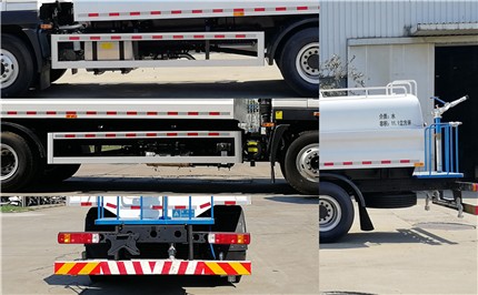 ABS型号:ABS-E,ABS/ASR-24V-4S/4M,CM4XL-4S/4M,3550D-1010,EBS 5;ABS生产企业:威伯科汽车控制系统(中国)有限公司,东科克诺尔商用车制动系统(十堰)有限公司,广州瑞立科密汽车电子股份有限公司,东科克诺尔商用车制动系统(十堰)有限公司,克诺尔制动系统(大连)有限公司;选装限速装置;限速装置限速(km/h):89km/h;选装描述:该车仅选用4700mm轴距,该车可选装前自动喷枪,此时具有前伸为600mm,相应车辆总长为8950mm;可选配鸭嘴形、尖嘴形前冲洒;该车并可选装后上喷雾,小卷盘;所用材料材质、连接方式以及后部防护装置的主要尺寸参数(断面尺寸和离地高度):侧防材料:铝合金,连接方式:螺栓连接,后防材料:Q235-B,后防截面尺寸:160?0mm,离地高度:480mm;罐体有效容积(立方米)、罐体外形尺寸(mm):装运介质:水;密度:1000kg/m3.罐体有效容积:11.1立方米,罐体外形尺寸(mm)(长轴锥讨嶙直线段):2200?300?100(直线段),罐体总长5190mm;专用功能及装置:该车配置水罐,水路喷洒水,高压冲洗装置和控制系统,主要用于路面降尘,冲洗作业; |