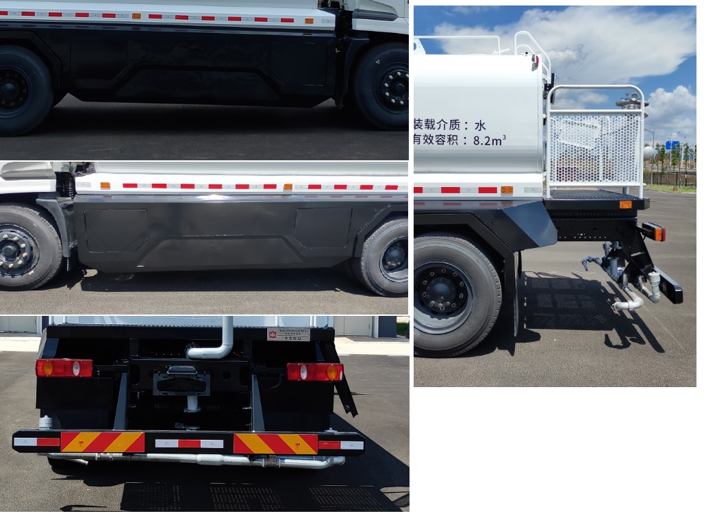 1.底盘选用轴距4500mm、前轮距1920mm、后轮距1880mm;2.罐体外形尺寸(长轴锥讨嶙长度)(mm):2210?260?350,介质名称:水,密度:1000千克/立方米,罐体有效容积8.2立方米;3.该车装有水罐、水路系统、清洗工作装置、后作业平台、控制系统,用于清洗作业;4.该车型工作装置有2种基本配置,配置A:无高压清洗系统,对应整车长7945mm.带前鸭嘴、后对冲、后圆柱型洒水、后低压水炮、后消防接口.选装:后万能球花洒,该选装对整车外形尺寸变化可忽略不计.配置B:带高压清洗系统(车前装前清洗喷水架),前伸950mm,整车长8895mm,带前鸭嘴、后对冲、后圆柱型洒水、后低压水炮、后消防接口、左右角喷、上下高压喷雾、高压卷盘,选装:后万能球花洒,该选装对整车外形尺寸变化可忽略不计;5.上述配置A和配置B都可选装前置智能水炮,其中配置A选装时,前伸500mm,整车长8445mm,选装对于整车重量变化均可忽略不计.配置B选装时不影响整车外形尺寸,选装对于整车重量变化均可忽略不计;6.侧防护材料为玻璃钢,连接方式为螺栓连接.后防护材料为Q355B,连接方式为螺栓连接,离地高度为495mm;7.随底盘选装驾驶室前角扰流板、前雾灯,选装卧铺侧窗装饰板,选装驾驶室顶部中间三个装饰灯,驾驶室选装不同前面罩;8.安装具有卫星定位功能的行驶记录仪;9.电池种类/生产企业:磷酸铁锂电池/宁德时代新能源科技股份有限公司;10.ABS型号/生产企业:J ABS/焦作博瑞克控制技术有限公司;11.该车可选装非直接供电ETC车载装置. |