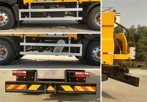 该车主要用于清理路面、管道、沉积物或清洗及清洁作业.专用装置为罐体、高压水泵;罐体有效容积为:10.5立方米,介质为水,密度:1000kg/立方米;仅采用3950mm轴距.罐体截面为多边形及圆弧组成,长卓碜高:3000?400?650 mm.侧防护材料为铝合金,后防护材料为Q235,侧、后防护连接方式均为螺栓连接,后防护截面尺寸为:300?0(mm),离地高度:495(mm).随底盘选装前面罩,前保险杠,前组合灯具;选装自动排管器;ABS型号/厂家:ABS/ASR-12V-4S/4M/襄阳东风隆诚机械有限责任公司. |