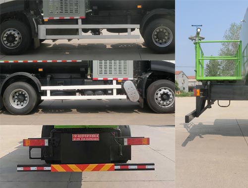 随底盘选装驾驶室;选装宽体前喷架结构,选装洗刷结构,其对应前伸1300毫米,车长11225毫米;选装窄体前喷架结构,其对应前伸550毫米,车长10475毫米。运输介质:水,密度:1000千克/立方米,罐体有效容积13.9立方米,罐体外形尺寸(长壮ぶ嶙短轴)(mm):5500?400?420。侧防护采用冷弯型钢/Q235-B,螺栓连接,后防护采用冷弯型钢/Q235-B,螺栓连接,后防护截面高度尺寸140mm, 截面宽度尺寸50mm,下边缘离地高度480mm。ABS型号/生产厂家:3631010-C2000/东科克诺尔商用车制动系统(十堰)有限公司,ABS 8/东科克诺尔商用车制动系统(十堰)有限公司,4460046450/威伯科汽车控制系统(中国)有限公司。该车用于道路清洗作用,主要专用装置为水罐。 |