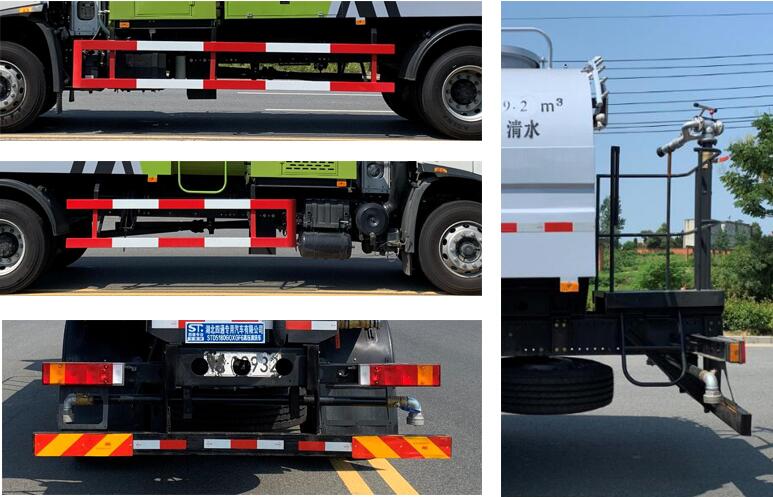 该车装有水罐,水路系统,清洗工作装置,作业平台,控制系统,用于清洗作业.罐体有效容积9.2立方米,罐体外形尺寸(长度壮ぶ嶙短轴)(mm):4050?280?450.介质名称:水,介质密度:1000千克/立方米.车辆选装前喷淋装置时总长为:10130mm(前伸960mm),宽度为:2550mm;侧防护和后防护材料均为Q235,与车辆的连接方式为螺栓连接;后防护装置断面尺寸:120?0mm,后防护离地高度:470mm,随底盘选装驾驶室;安装具有卫星定位功能的行驶记录仪,ABS型号/生产厂家:3631010-C2000/东科克诺尔商用车制动系统(十堰)有限公司,ABS 8/东科克诺尔商用车制动系统(十堰)有限公司, 4460046450/威伯科汽车控制系统(中国)有限公司,型号:CM4XL,仅用5000(mm)轴距, |