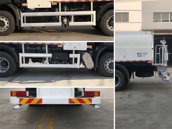 车辆主要专用装置为高压清洗装置,水罐体,水路系统,后作业平台和控制系统,主要用于城镇环境清洗作业,对路面喷洒水降尘,园林绿化.仅选用4350+1350mm轴距.前伸为865mm.罐体外形尺寸(长轴锥讨嶙罐长)(mm):2186?420?500,有效容积:13.6立方米,介质名称:水,介质密度:1000千克/立方米.随底盘选装驾驶室前面罩;驾驶室前角扰流板为选装件;选装驾驶室前面罩、前保险杠及前部灯具和后视镜,对应前悬1500mm;驾驶室顶部中间三个装饰灯为选装件;前雾灯为选装件;驾驶室侧窗选装树脂装饰板.选装车前无冲洗装置,对应长9800mm(前悬1480mm);9820mm(前悬1500mm),接近角20?后部选装圆形喷嘴.选装卷管总成.选装左右绿化浇灌装置.选装箭头式作业指示灯.顶部选装绿化浇灌装置.ABS型号/生产厂家:3631010-C2000/东科克诺尔商用车制动系统(十堰)有限公司,ABS 8/东科克诺尔商用车制动系统(十堰)有限公司,4460046450/威伯科汽车控制系统(中国)有限公司.车辆侧面防护装置的材料材质为铝合金,连接方式为螺栓连接.后下部防护装置的材料材质为Q235钢,连接方式为焊接,断面尺寸(mm)为80?60,最大离地高度为495mm. |