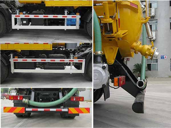 该车专用装置为真空泵及管道系统,用于吸污作业.罐体为圆形截面,罐体外形尺寸(直径字倍纬?(mm):φ1412?350,有效容积:5.83立方米.运送介质品名:悬浮污物;介质密度:800千克/立方米.仅采用轴距为3800mm的底盘.随底盘选装驾驶室外观样式,选装无吊臂;后防护栏的材料材质:Q235;侧防护的材料材质:铝合金型材;防护栏安装采用螺栓联接;后护栏截面尺寸/离地高(mm):140?40/460.装有ABS,ABS型号/生产厂家:3631010-C2000/东科克诺尔商用车制动系统(十堰)有限公司.