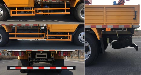 该车专用装置为割灌机,用途为对路边绿化带进行修剪,整备质量(kg)/载质量(kg)/前伸(mm)/长度(mm)/高度(mm)/接近角(?对应关系分别为:1.选装短臂割灌机:3570/600/0/5995/2780/20;2.选装短臂割灌机及门架:3590/580/175/6170/2780/11;3.选装短臂割灌机及打草机:3920/250/1605/7600/2780/11;4.选装长臂割灌机:4010/160/0/5995/3420/20;5.选装长臂割灌机及门架:4030/140/175/6170/3420/11;6.选装长臂割灌机及打草机:4160/10/1605/7600/3420/11;侧防护及后防护装置材料均为Q235,连接方式均为螺栓连接;后下部防护断面尺寸为100mm?5mm,离地高度:395mm;ABS系统型号:APG3550500A,ABS系统生产厂家:浙江亚太机电股份有限公司;发动机最大净功率对应关系为:JX4D30B6H:83KW,JX4D30A6H:93KW. |