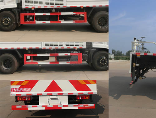 随底盘选装驾驶室;选装整体式喷水架结构,其对应前伸1200毫米;选装单管道喷洗架,其对应前伸为50毫米。左右分体式喷水架前伸为550毫米。ABS型号/生产厂家:3631010-C2000/东科克诺尔商用车制动系统(十堰)有限公司,ABS 8/东科克诺尔商用车制动系统(十堰)有限公司, 4460046450/威伯科汽车控制系统(中国)有限公司。侧防护采用冷弯型钢/Q235-B,螺栓连接;后防护采用冷弯型钢/Q235-B,螺栓连接,后防护截面高度尺寸120mm, 截面宽度尺寸50mm,下边缘离地高度480mm。该车用于路面的清洗养护作用,主要专用装置为清洗架和水箱。车长/轴距/前伸对应关系为:9650/5000/1200,9000/5000/550,9500/4700/1200,8850/4700/550,10330/4700/1200,9680/4700/550. |