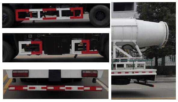 1,该车主要用途为抑尘降霾.专用装置为水罐,风机,该车后端安装风机为320度旋转,当旋转到车辆最后端时,后伸量为800mm,2:防护材料:Q235,连接方式:左右侧面及后下部防护均采用焊接连接,后部防护断面尺寸(mm):100?0,后部防护离地高度(mm):500.4:ABS的型号及生产厂家: J ABS/焦作博瑞克控制技术有限公司.随底盘选装驾驶室前脸局部造型变化. 选装上装结构,仅采用轮胎10.00-20 18PR,11.00-20 18PR,11.00R20 18PR