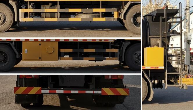 用于废旧沥青混合料的加热再生;随底盘选装侧窗,前雾灯,顶部装饰灯,选装前轮盘式制动器,选装一种外观样式,侧防护装置与车架纵梁螺栓连接,材质为Q235;后防护与车架螺栓连接,材质为Q235,离地高度500mm,截面尺寸120x60mm,装有ABS,ABS型号:3631010-C2000,生产厂家:东科克诺尔商用车制动系统(十堰)有限公司。 |