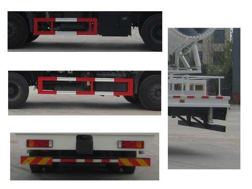 1.随底盘选装驾驶室,高顶驾驶室顶部气喇叭为选装件。选装后部风机样式。上装图案颜色可变化。该车后端安装风机可旋转,当旋转到车辆最后端时,后伸量为900mm、1100mm、1400mm。仅用4350+1350(mm)轴距。2.整车长/前悬/后悬/后伸(mm)对应关系:9750/1480/2570/0,9750/1500/2550/0,11450/1480/3370/900,11450/1500/3350/900,11650/1480/3370/1100,11650/1500/3350/1100,11950/1480/3370/1400,11950/1500/3350/1400。侧、后防护装置材料材质:Q235, 连接方式焊接加螺栓连接,后部防护装置断面尺寸(宽赘?60?20(mm),后部防护离地高度500mm。ABS生产厂家:东科克诺尔商用车制动系统(十堰)有限公司;型号:3631010-C2000。 |