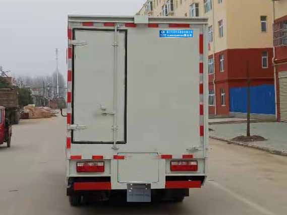 该车是进行舞台文艺表演的专用车辆;专用装置:厢体,折叠式舞台.随底盘选装驾驶室.侧防护为裙板结构,离地高为(mm):450后防护装置材料材质为Q235A碳钢,焊接连接,后防护断面尺寸(宽赘?50?00(mm),离地高度为480mm.ABS厂家及型号:襄阳东风隆诚机械有限责任公司/ABS/ASR-12V-4S/4M.此车整车长/轴距对应关系为(mm):5995/3308,5637/2950,5387/2700.选装正后部图片. |